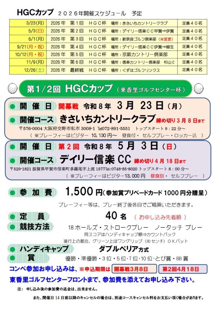 レッスンイベント ! お正月は終了いたしました。 次回はゴールデンウィーク! 受講料2ヶ月 半額キャンペーン 体験レッスン2,000円キャンペーン 北海道ゴルフツアー 過去のツアー情報はこちら HGC杯ゴルフコンペのご案内